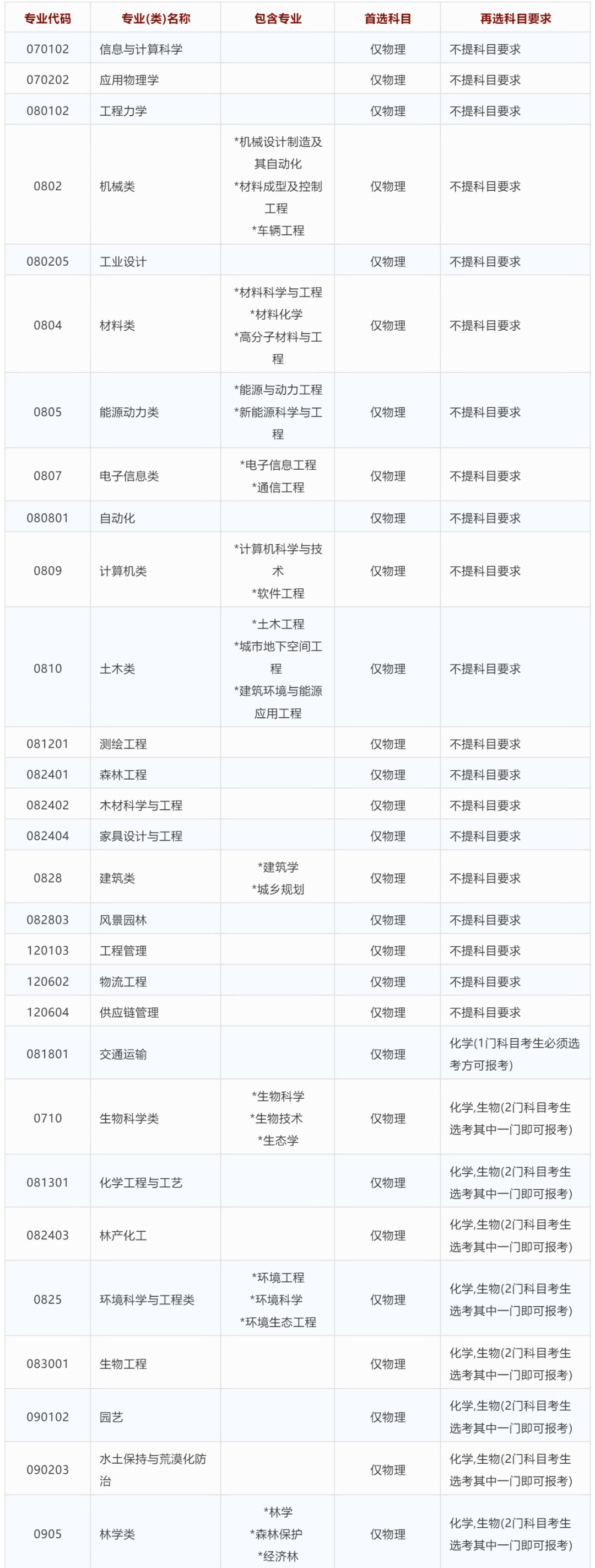 说明:下表信息为我校现有本科专业(类)对高考综合改革“3+3”选考模式提出的选考科目及要求,所列专业(类)是否在生源省有招生计划,须查阅生源省省级招考部门公布的年度我校招生计划信息。下表中的信息如有变化,以生源省省级招考部门公布的信息为准。